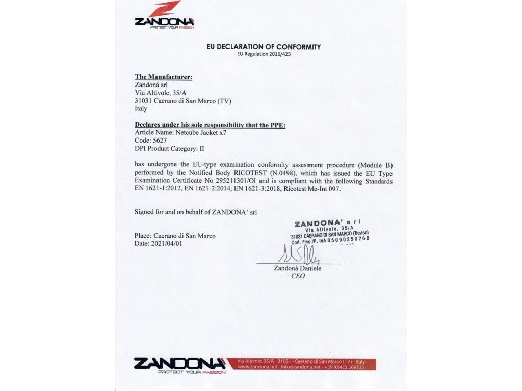 chránič s certifikátem CE úrovně 2 (EN 1621-2) pro záda, (EN 1621-3) pro hruď a žebra, (EN 1621-1) pro lokty