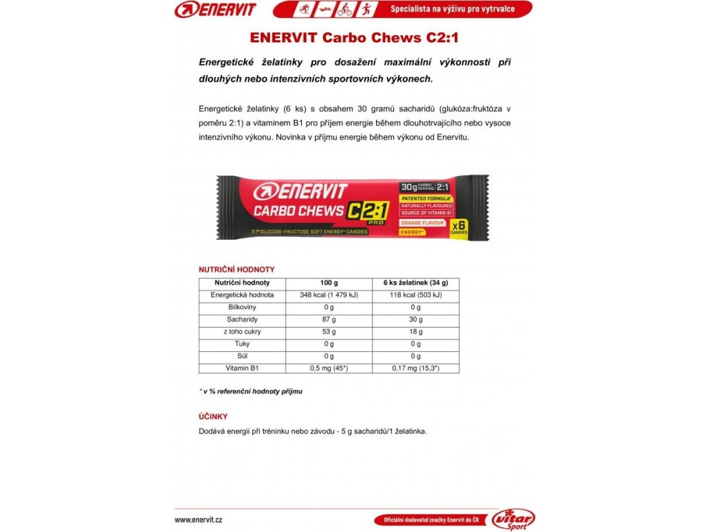 6 ks želatinek s obsahem 30 gramů sacharidů (glukóza:fruktóza v poměru 2:1) a vitaminem B1