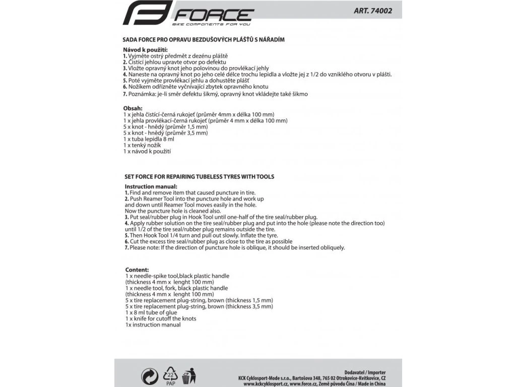 sada FORCE pro opravu defektu u bezdušových (tubeless) plášťů s nářadím obashuje: