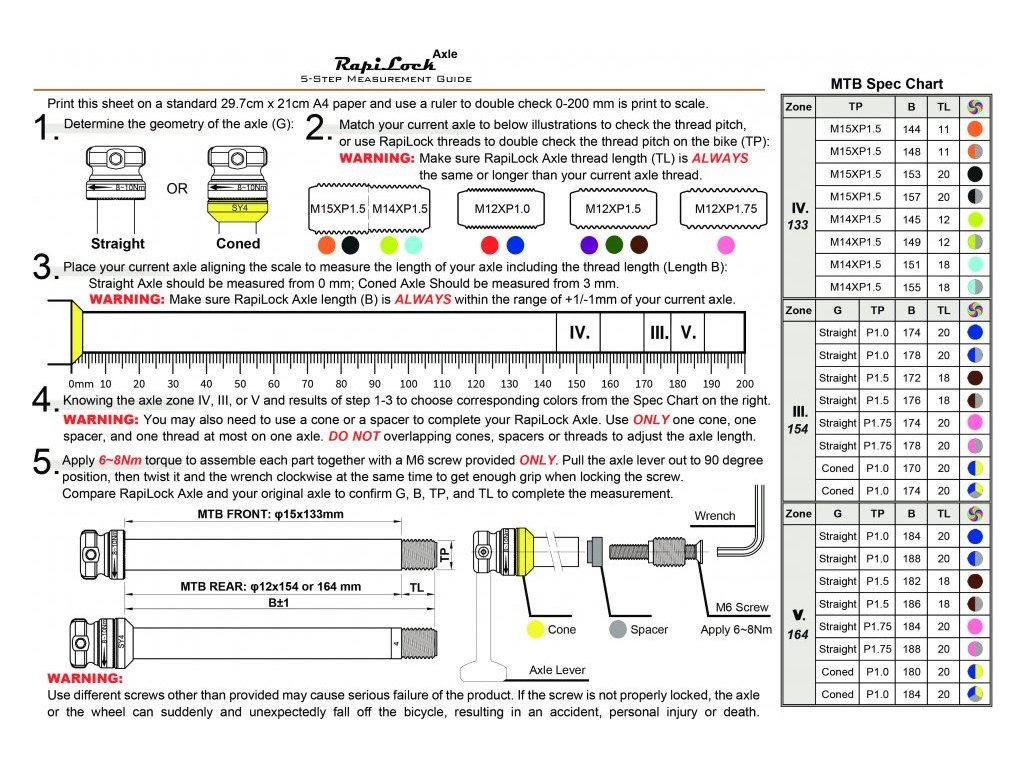 RapiLock poskytuje nejen cyklistickým prodejnám, ale i koncovým uživatelům snadné řešení pro měření a výměnu pevných os. S průvodcem měření a nabídkou 5 různých délek (105/133/147/154/164 mm) a stoupání závitů (P1,0/P1,5/P1,75) je možné pokrýt více než 60 standardních kombinací. Tento systém usnadňuje správný výběr a výměnu osy pro většinu modelů kol.