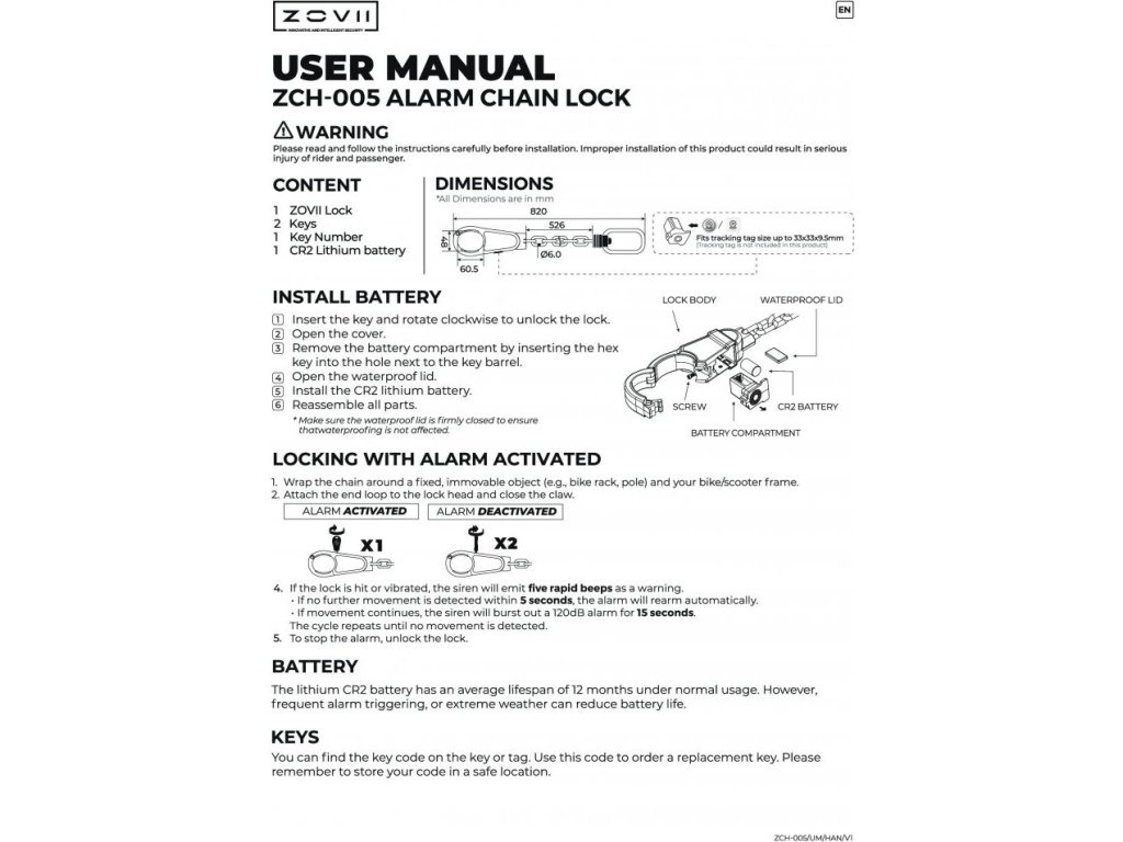 Řetězový zámek ZOVII ZCH-005 s integrovaným alarmem je navržen pro maximální ochranu jízdních kol, elektrokol i elektrokoloběžek. Pevné ocelové tělo a odolný řetěz z uhlíkové oceli poskytují vysokou mechanickou bezpečnost, zatímco kompaktní, ale robustní konstrukce je vhodná pro většinu běžných rámů kol a koloběžek.