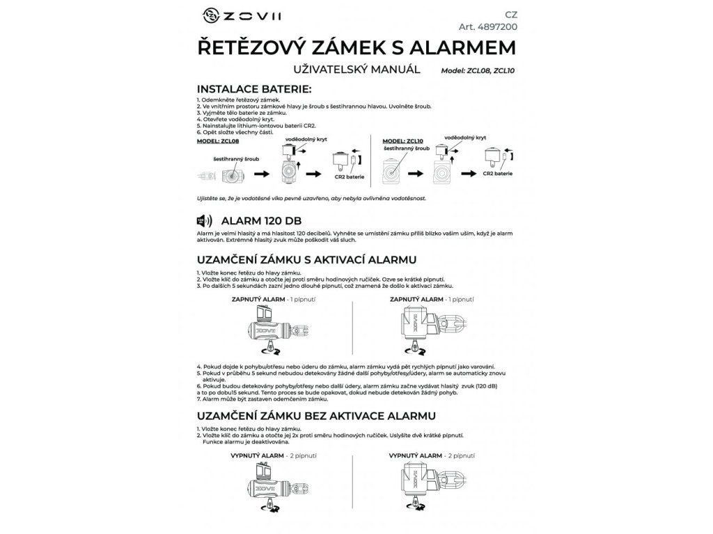 obsah balení: řetězový zámek, klíče 3x, šestihranný klíč, baterie CR2, kódové značení klíčů, manuál